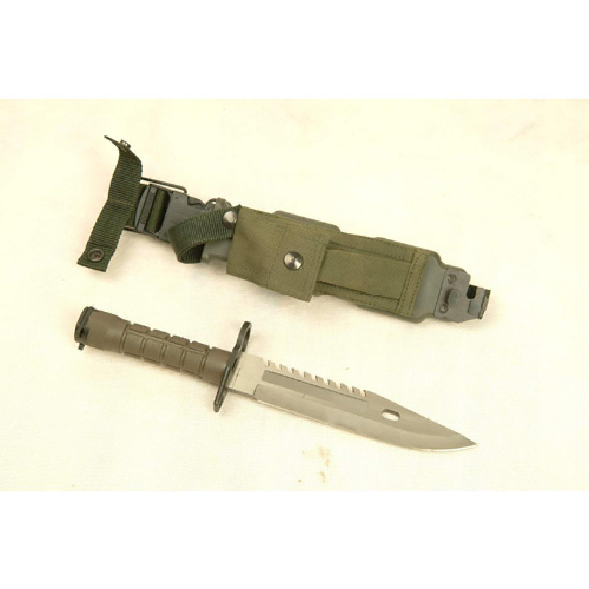 虎牙軍刀可作單兵匕首使用,具有砍、割、刺、劈、鋸等功能,可剪斷4毫米以下的鐵絲,刺穿1毫米厚的低碳鋼板;當(dāng)作為刺刀使用時(shí),可以與M16自動(dòng)步槍相連接。附件袋中可容納手槍彈匣及其他小件物品,適合野外生存使用。